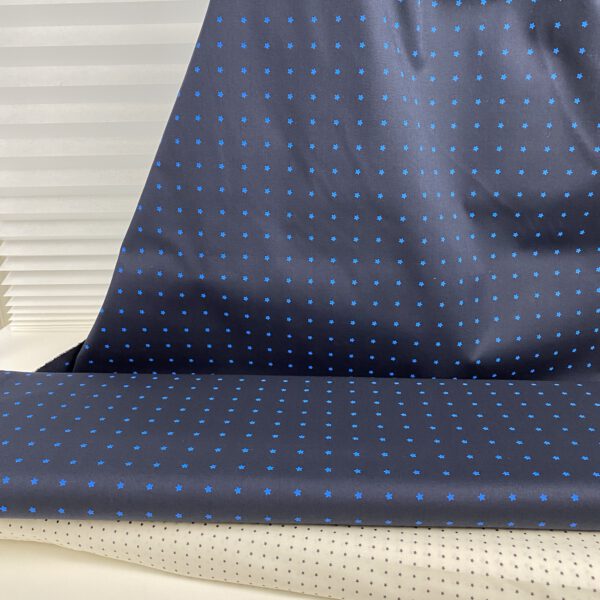 Niedlicher Baumwollstoff in leichter Popelinequalität. Mit kleinen blauen Sternchen auf dunkelblauem Untergrund.