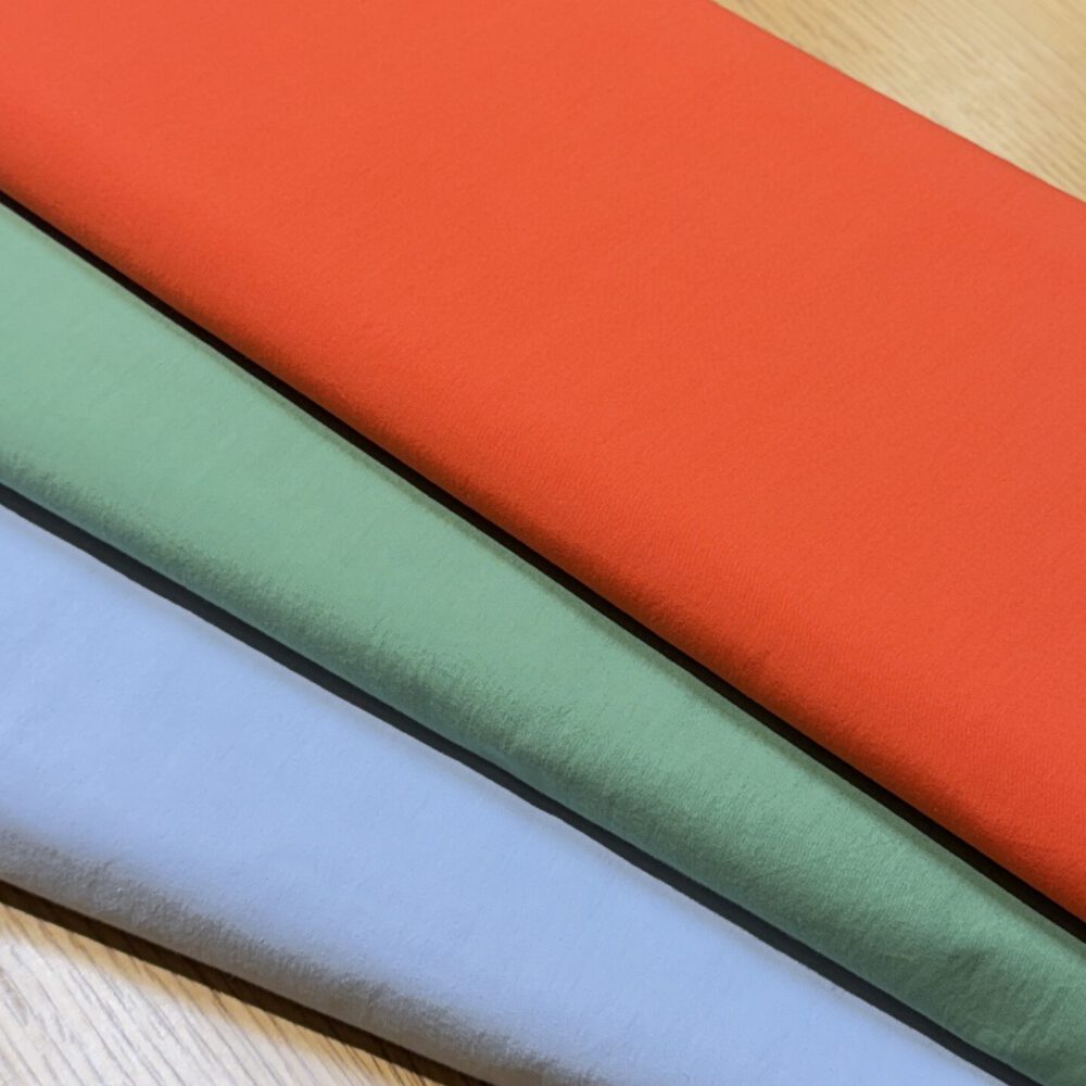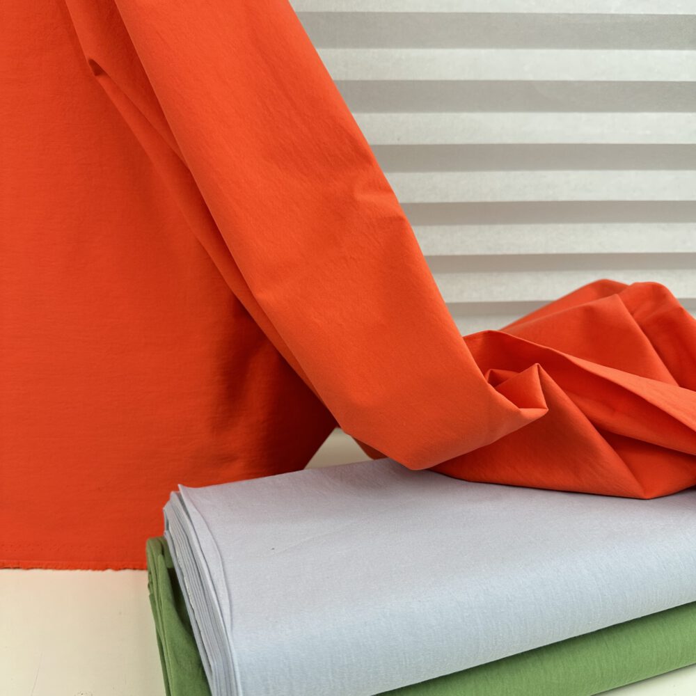 Hier kommt das Material der Saison – Stone Washed Popeline. Dieser Stoff hat einen festen Griff und eignet sich für Modelle die etwas Stand benötigen.