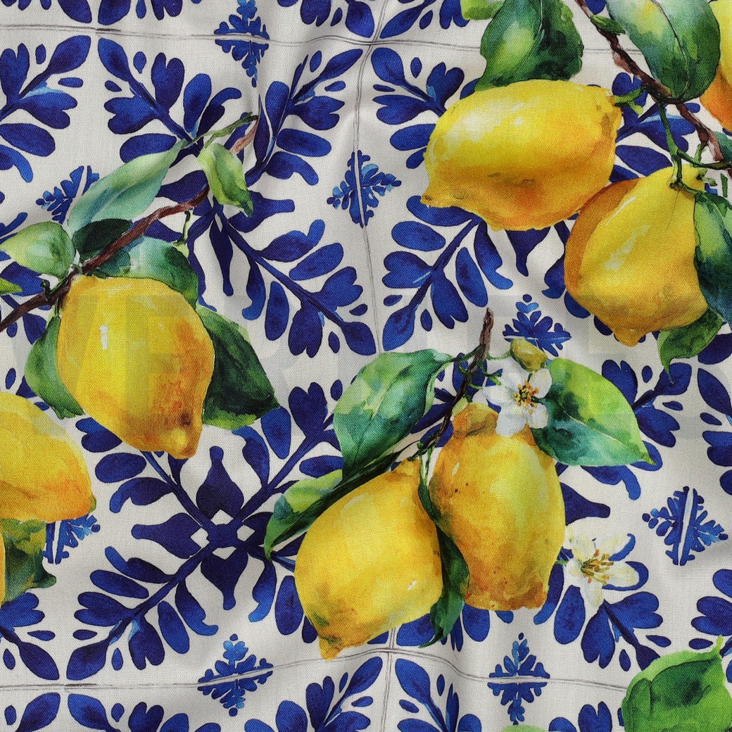 Dieser ausdrucksstarke Stoff begeistert mit einem frischen Zitronen-Design im stilvollen mediterranen Look. Leuchtend gelbe Zitronen mit saftig grünen Blättern ranken sich über einen dekorativen Hintergrund in klassischem blau-weißem Fliesenmuster und verleihen dem Stoff eine sommerliche, elegante Ausstrahlung. Der detailreiche Digitaldruck sorgt für brillante Farben, feine Farbverläufe und eine besonders hochwertige Optik.