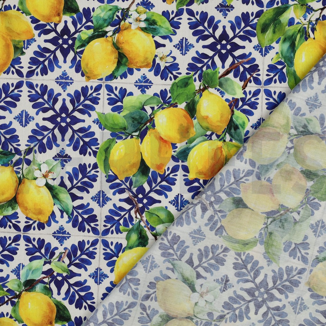 Dieser ausdrucksstarke Stoff begeistert mit einem frischen Zitronen-Design im stilvollen mediterranen Look. Leuchtend gelbe Zitronen mit saftig grünen Blättern ranken sich über einen dekorativen Hintergrund in klassischem blau-weißem Fliesenmuster und verleihen dem Stoff eine sommerliche, elegante Ausstrahlung.